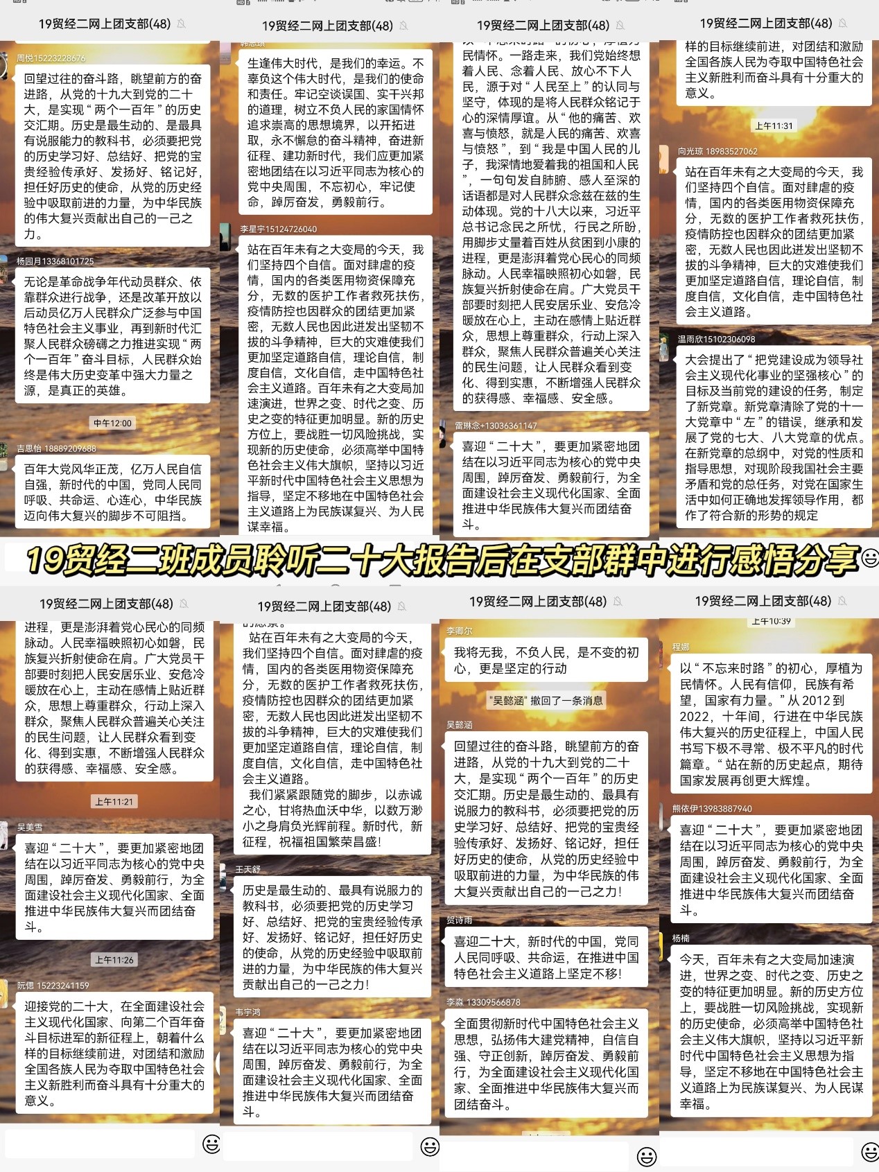 10月16日上午,中国共产党第二十次全国代表大会在北京人民大会堂隆重开幕,习近平总书记代表第十九届中央委员会向大会作报告。中国共产党第二十次全国代表大会是在全党全国各族人民迈上全面建设社会主义现代化国家新征程、向第二个百年奋斗目标进军的关键时刻召开的一次十分重要的大会。经济学院各团支部积极响应,在做好疫情防控的情况下,采取多种学习形式,全方位、多角度学习了党的二十大报告。