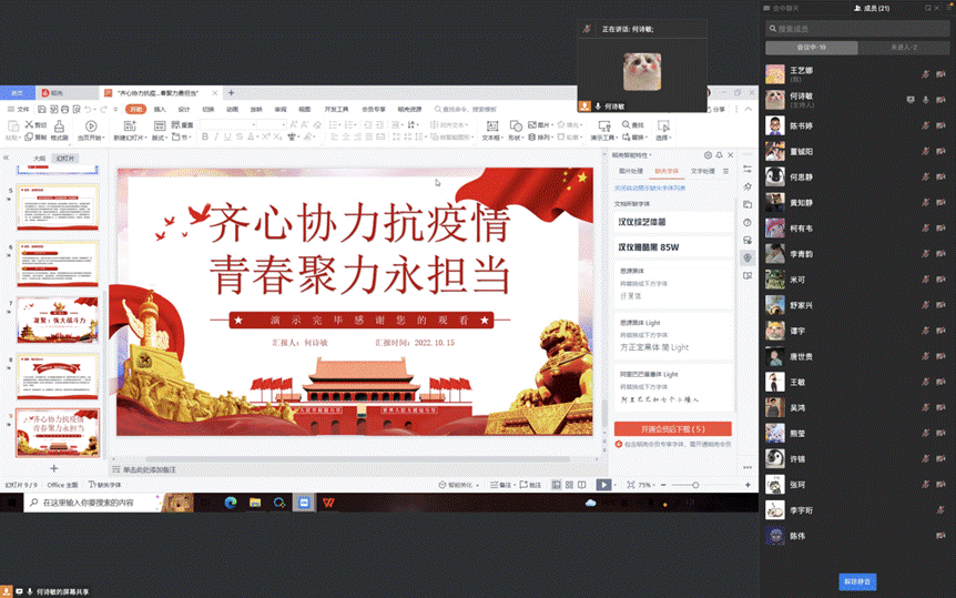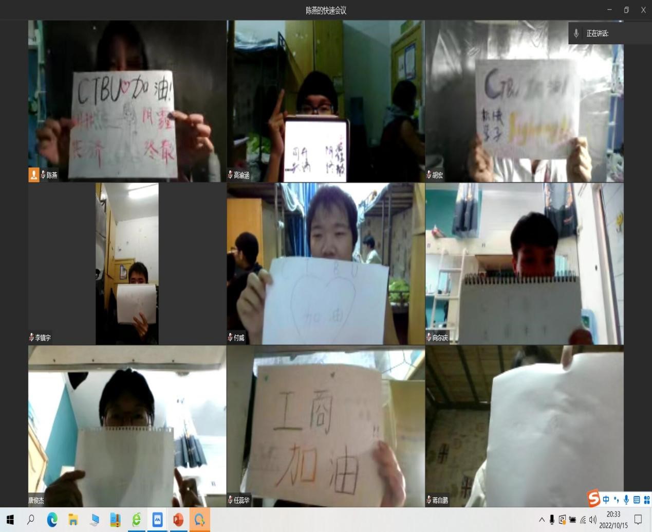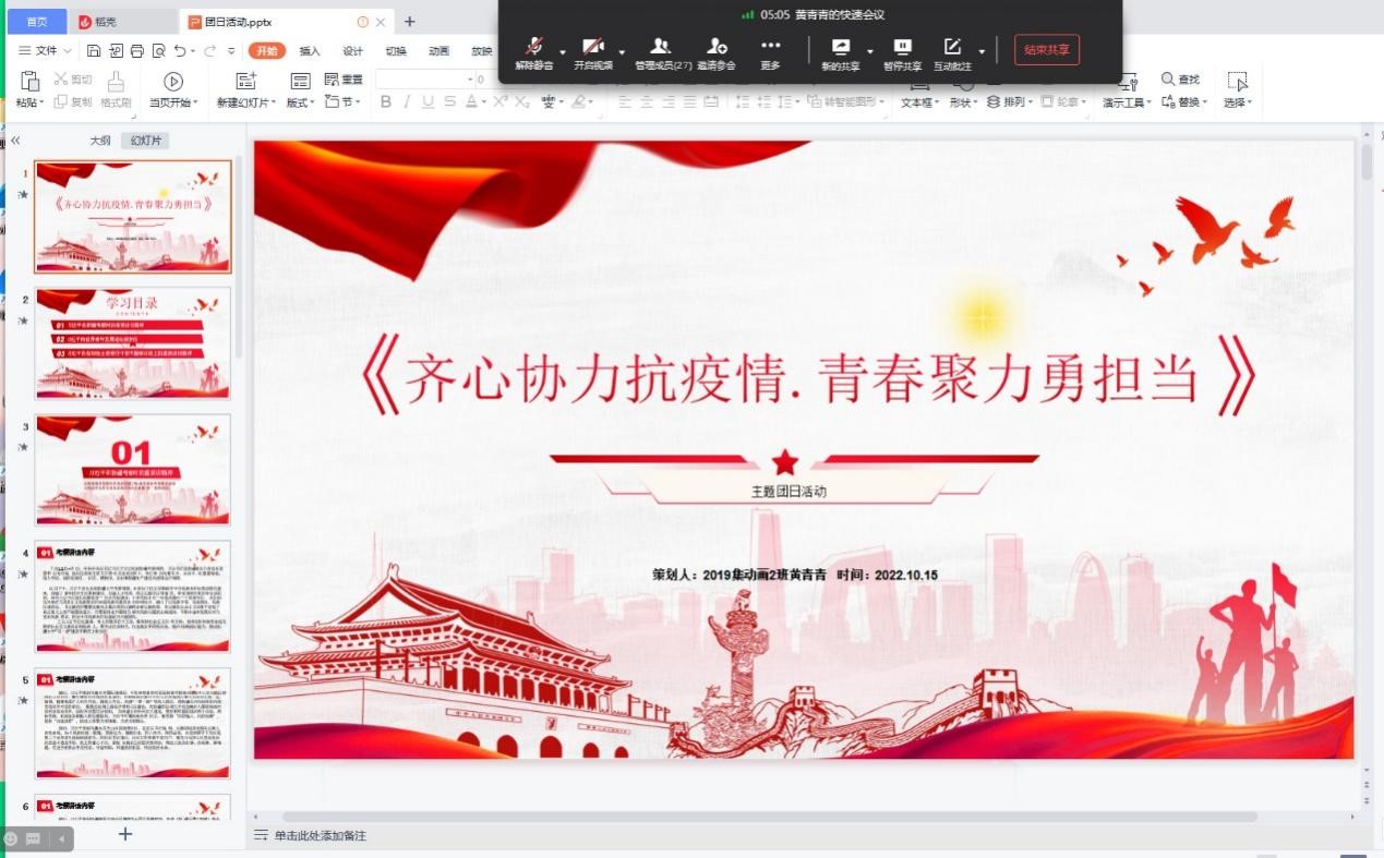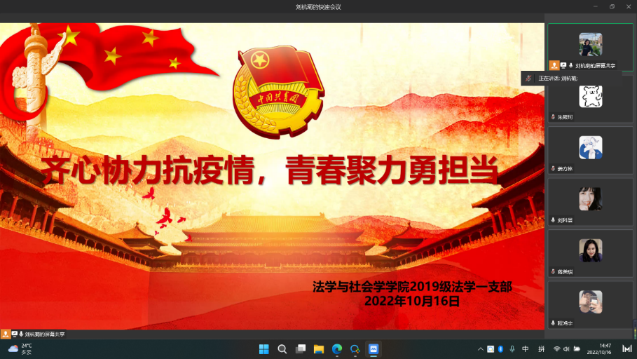 10月15日至16日,法学与社会学学院组织团支部在企业微信上开展“齐心协力抗疫情,青春聚力勇担当”线上主题团日活动。团日活动主要围绕奏唱团歌《光荣啊,中国共青团》、校园疫情生活分享和学习党的二十大重要精神三部分展开。活动当日正是中国共产党第二十次全国代表大会的召开之日。各团支部组织支部成员共同观看本次大会直播,并于团日活动中作出学习总结。