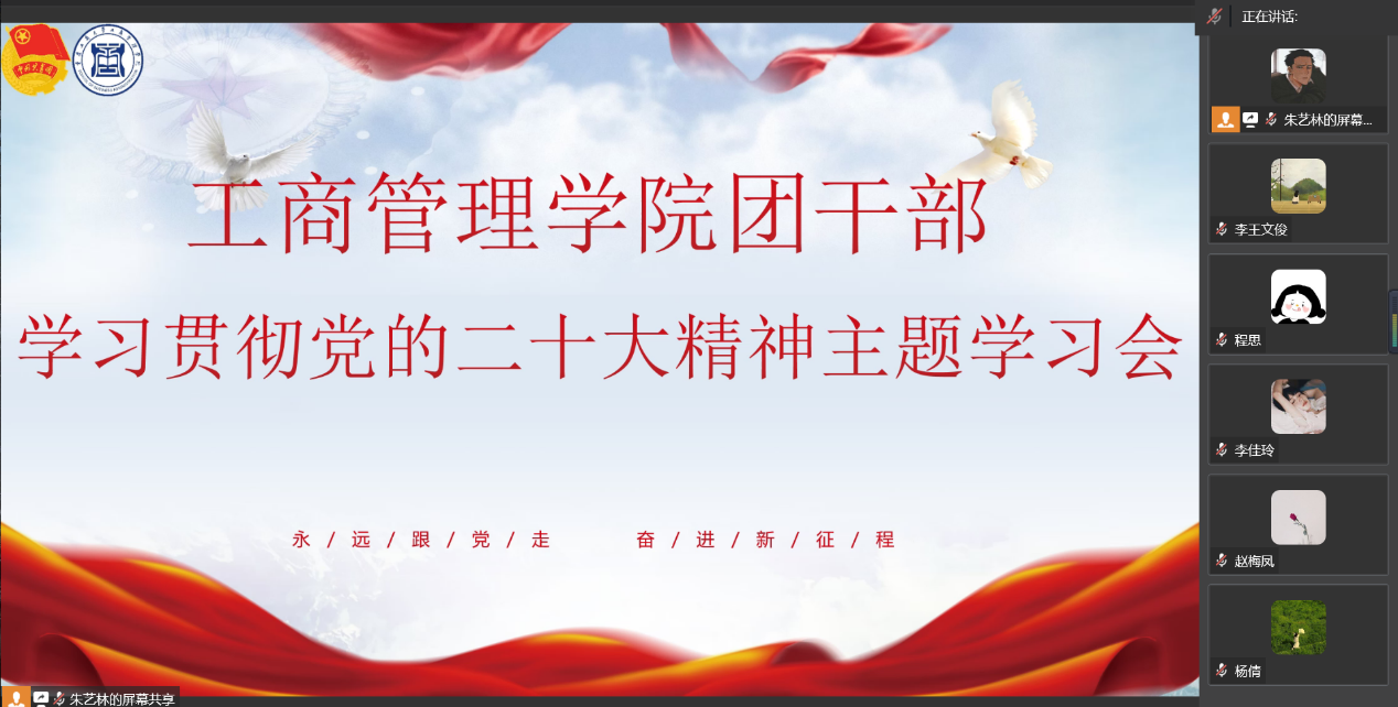 11月18日,工商管理学院在企业微信线上举行“学习宣传贯彻党的二十大精神主题学习会”。工商管理学院全体团干部参与了本次学习会,会议由工商管理学院分团委学生副书记朱艺林同学主持。