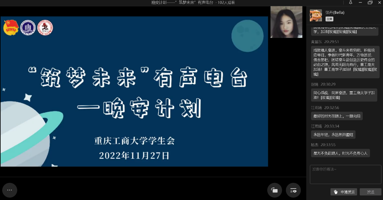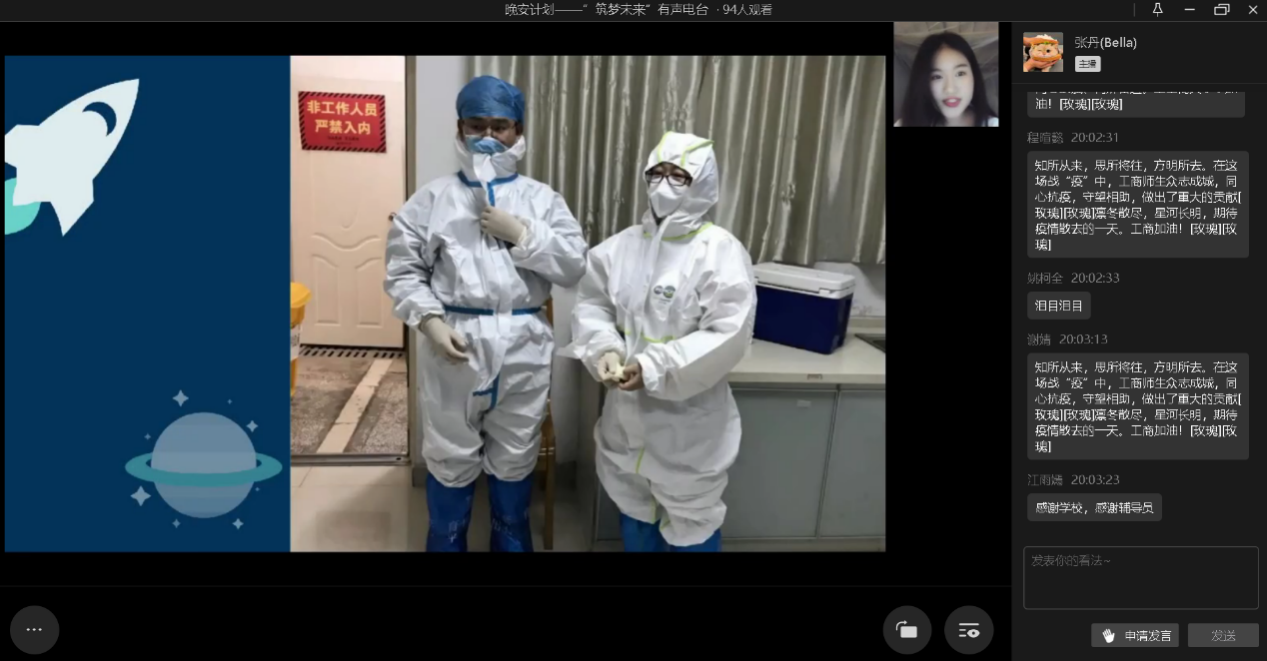 为增强同学们战胜疫情的信心,为同学们提供抚慰心灵、传达真情的平台,11月27日晚,由校团委主办、校学生会承办的“筑梦未来”晚安有声电台通过企业微信线上直播的方式顺利举行,传播温暖与传递祝福。本次活动由校艺术团语言艺术分团王艺洋同学主持。