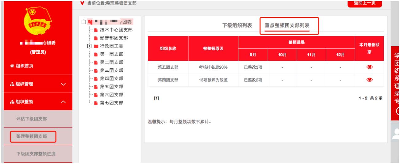 1.上级团组织负责人登录系统进入管理中心,点击“组织整顿-整理整顿团支部”菜单,点击“重点整顿团支部列表”按钮,进入“重点整顿团支部列表”界面。
