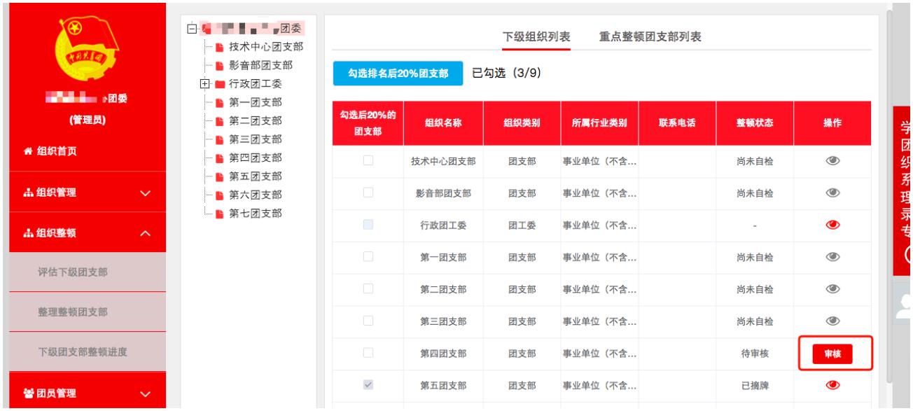 上级团组织在“下级组织列表”界面可以查看到所有下级团支部的自检表提交情况,及是否被勾选为排名后20%团支部。但是团支部自检表审核权限及勾选排名后20%支部权限仅直属上级团组织负责人具有。