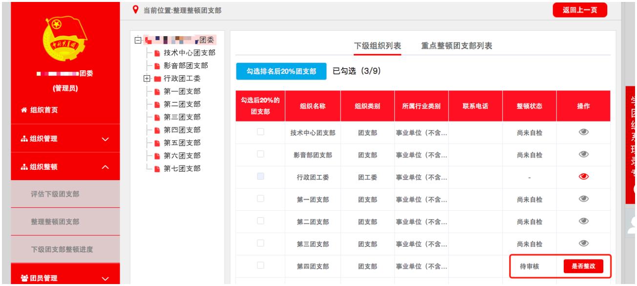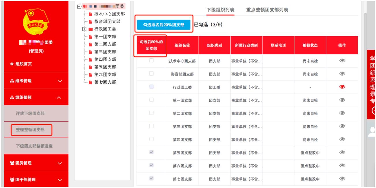 2.研究确定后点击界面左上角的“勾选排名后20%团支部”按钮,被勾选的团支部纳入重点整顿对象,整顿状态变为重点整改中。