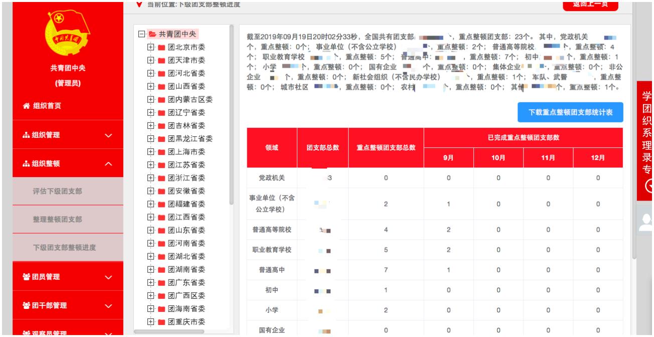 1.团组织负责人登录系统进入管理中心,点击“组织整顿-下级团支部整顿进度”菜单,可以看到本组织及所有下级组织不同领域的重点整顿团支部数量。