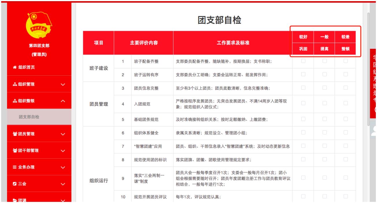 1.如果团支部自检表“较差项”大于等于10项,则必须纳入重点整顿团支部。