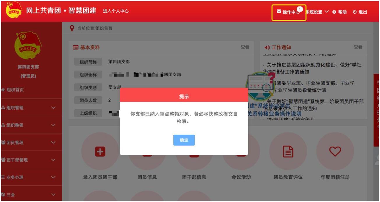 1.团支部负责人登录系统,如果该支部被纳入重点整顿团支部,则会看到相应的提示,同时可以在“操作中心”看到上级审核的结果。