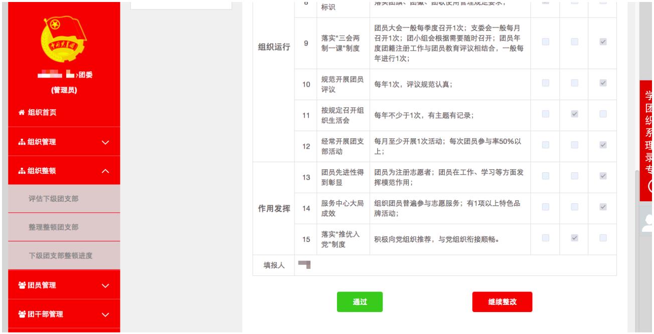 1.上级团组织负责人在“下级组织列表”界面,可以再次审核团支部新提交的自检表。点击“通过”按钮,则表示该支部完成整改;若点击“继续整改”按钮,则表示该支部整改任务尚未完成,需要继续提交自检表,直至通过审核。