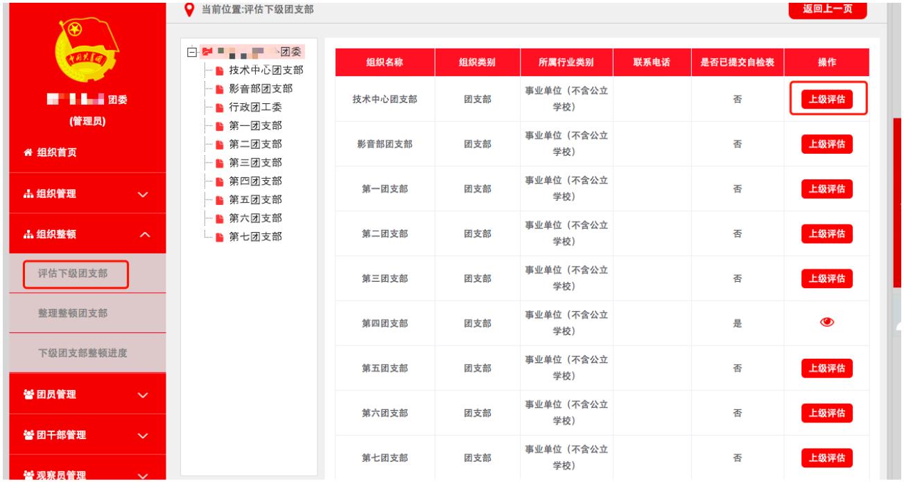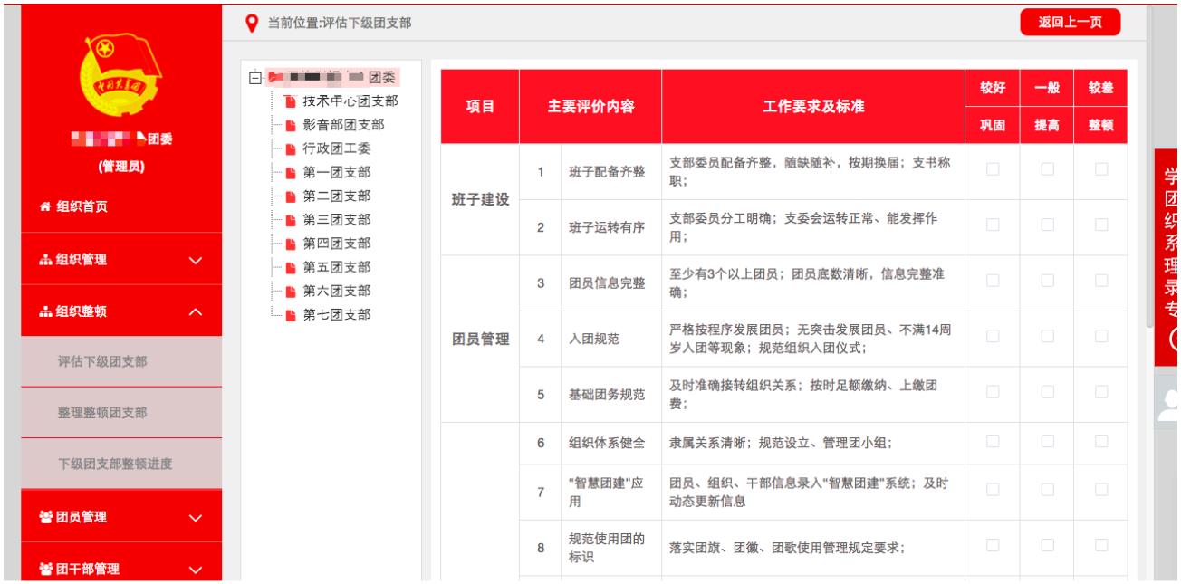 1.上级团组织负责人(管理员、下同)登录系统进入管理中心,点击“组织整顿-评估下级团支部”菜单,对于尚未提交自检表的团支部,直属上级有权限对其进行直接评估。