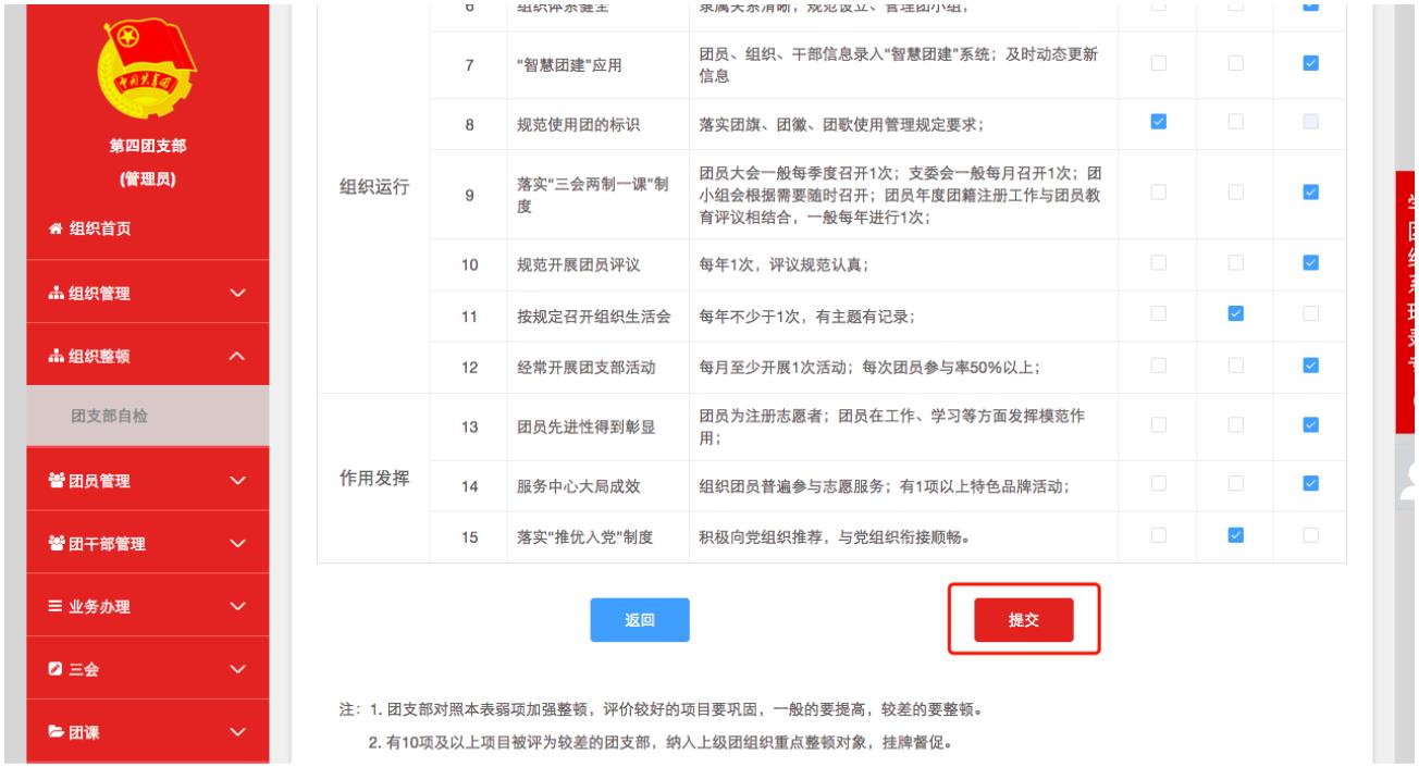 2.根据支部建设情况如实完善团支部自检表,点击“提交”。提交成功后等待上级审核。