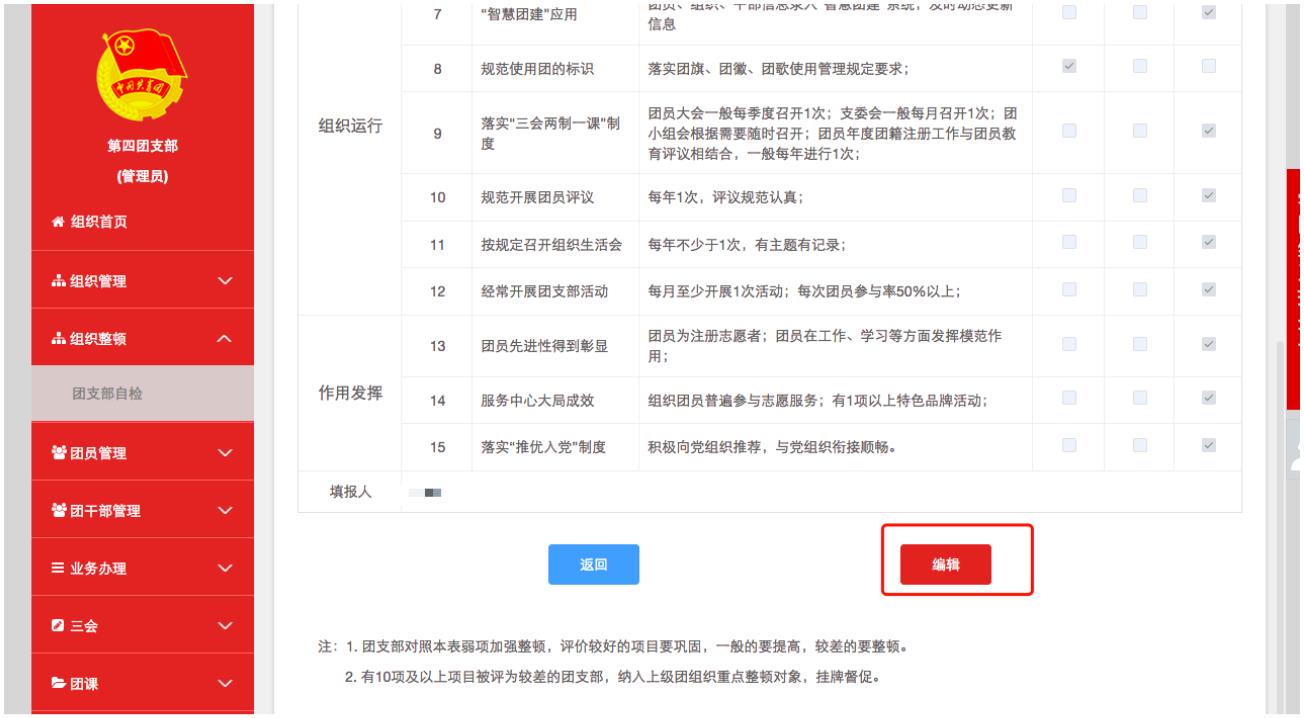 7、审核结果为“继续整改”的支部,整改后再次提交“团支部自检表”,直至通过审核。