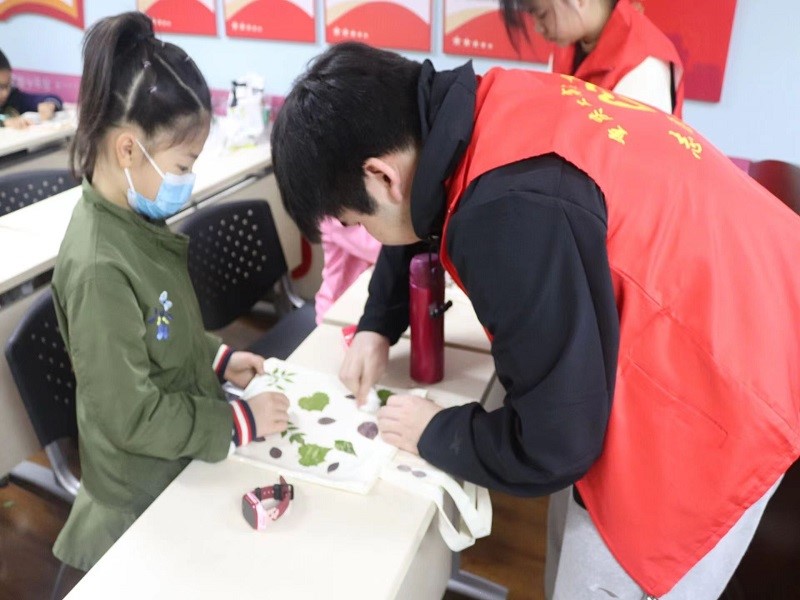 本次活动内容主要是让汇雅社区少年宫的孩子们拓印植物,带领孩子们亲近自然。在活动过程中,志愿者给孩子们播放了拓印树叶的教程视频,让孩子们对拓印树叶有了一个简单的认知。志愿者与孩子们将泡过明矾的树叶摆放在帆布袋或者口罩上,用胶布将树叶固定在上面。在志愿者们的带领下,孩子们通过反复捶打等方式将树叶的纹路拓印下来。树叶的绿色,紫色等各种颜色在孩子们的作品上交相辉映,展现出大自然独特的韵味。