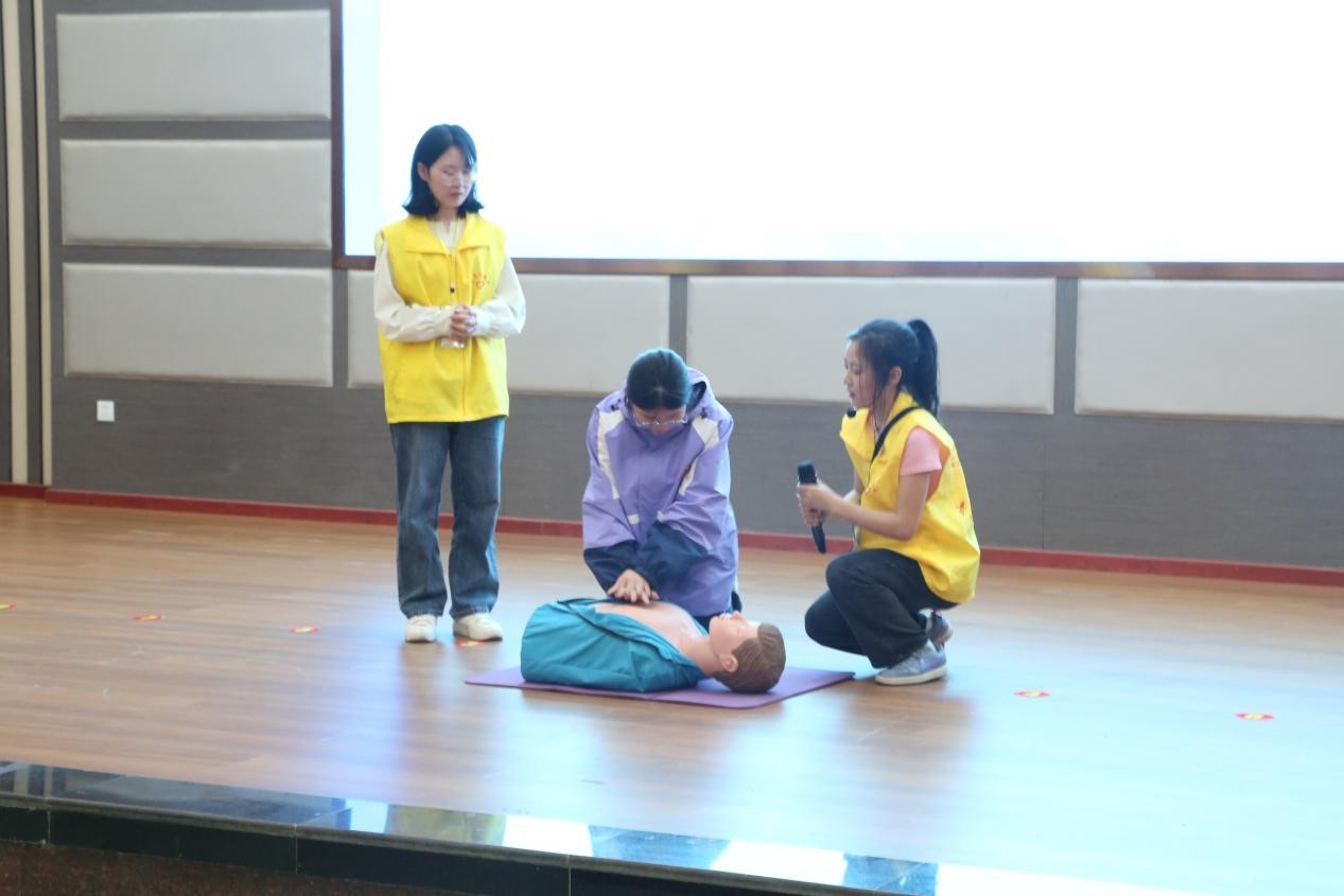 培训会现场,志愿者们娓娓道来,向同学们普及在什么情况下需要拨打120?如何正确的与医生沟通?心肺复苏法的正确操作步骤?此外,志愿者们现场演示心肺复苏法、开放气道、人工呼吸、AED正确使用方法以及海姆立克急救法。志愿们用专业且通俗易懂的讲解为同学们展现了一场意义非凡的急救技能与知识培训。理论促实践,实践出真知。为使同学们更加直观的掌握急救要领,志愿者们利用CPR假人模型现场进行了应急救援技能演示,现场与同学们进行互动,手把手指导操作技能,模拟救护,发现问题解决问题,在志愿者的指导帮助下,同学们在实践中逐渐熟练急救操作技能。