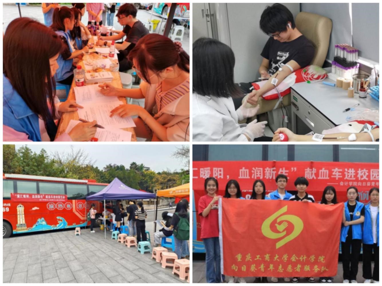 为积极倡导“义务献血,关爱他人”的公益精神,弘扬社会主义核心价值观,会计学院向日葵青年志愿者服务队于2023年4月18日至4月21日联合重庆市血液中心在校前广场举办“爱汇暖阳,血润新生”无偿献血活动。