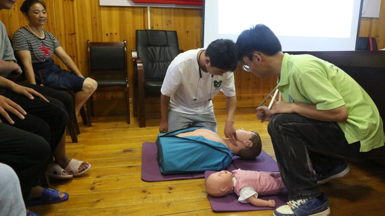 “大家知道我们在遇到紧急医疗情况下该如何正确拨打120吗?心肺复苏的具体步骤应该如何正确操作?面对不同年龄段的对象被异物梗阻时,我们又应当如何选择正确合适的方法?”一连串的提问下,村民们被带入此次培训活动。心肺复苏法、AED(自动体外除颤仪)正确使用方法以及“剪刀石头布”的海姆立克急救法,志愿者用专业且通俗易懂的方式为村民讲解这些内容。