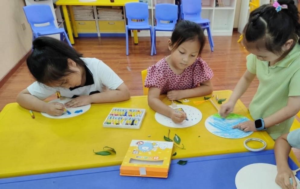 (小朋友用树叶自绘扇子 图/陈娟)