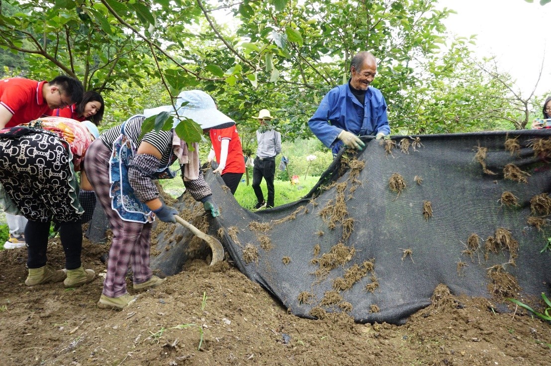 (观察团成员为柿子树下种植的竹荪除草)