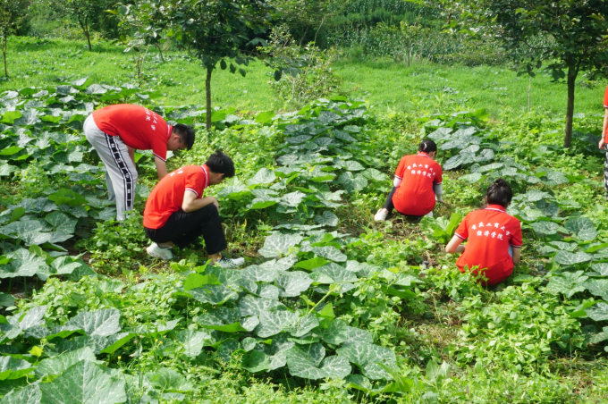 (观察团成员在南瓜地中清理杂草)