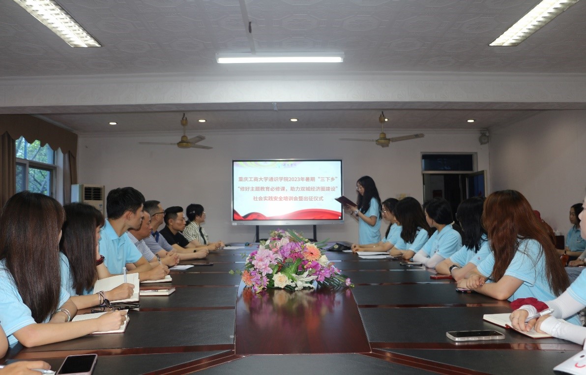 7月16日上午,通识学院2023年暑期“三下乡”社会实践活动安全培训会暨出征仪式在江北校区修德楼三楼会议室顺利举行。江北校区管委会副主任赵雄、通识学院党总支专职组织员宫彪、综合办公室主任张杰、分团委指导老师梅艺及“修好主题教育必修课,助力双城经济圈建设”实践团全体成员参加了会议。会议由梅艺老师主持。