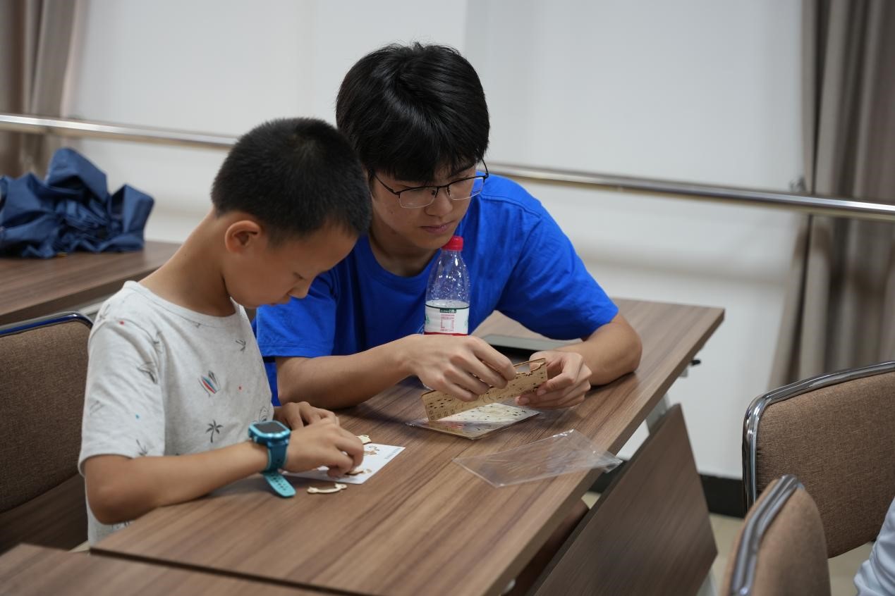 激光切割课堂上,宣讲团成员用通俗易懂的语言为社区青少年讲解激光切割原理,针对什么是激光切割,怎么切割等专业问题展开详细介绍,再通过实物作品、视频等展示操作,进一步激发青少年学习兴趣。随后,宣讲团成员与青少年相互协作,完成木板拼图拼装,进一步锻炼青少年动手能力,培养青少年合作意识。课程结束后,青少年朋友们意犹未尽,迫不及待进入第二节课堂。智能机器人课堂上,宣讲团用定义引出课堂主角——NAO机器人,通过视频结合图片讲解,帮助青少年快速了解NAO机器人相关功能,感受科技的乐趣与神奇。