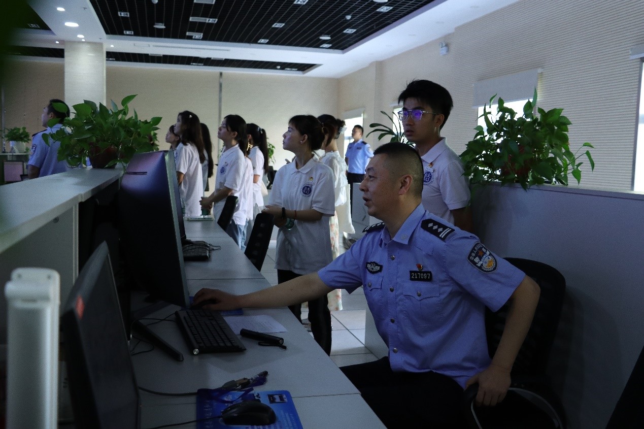在应急指挥中心,服务队师生了解到了接警岗、复核岗、巡查岗、调度岗等多个岗位的具体工作职责。指挥中心主任张猛用一个现实案例向大学生志愿者们演示了派出所对警情的处置流程和细节,展示了日常工作中办案民警如何快速排查风险隐患,怎样根据实际情况制定应对措施,最终做到对于重点地段和人群的全覆盖管控。
