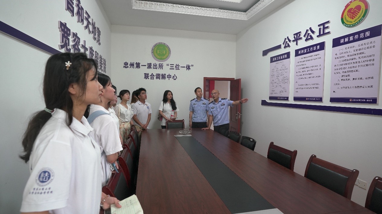 服务队一行来到忠州第一派出所,在教导员方会龙的讲解下,同学们进一步了解了基层一线民警的工作日常。民警们能够耐心细致地办理户政业务、处理社区工作,也能够在接到报警信息后第一时间出动警力守护辖区平安,对公安民警的“全能”同学们表示十分的钦佩。在忠州第一派出所“三位一体”联合调解中心,方会龙向大学生志愿者们介绍了联合调解中心的主要职能和重要作用,讲解了民警联合司法所工作人员、人民调解员共同调解处理的经典案例。张卫华和方会龙还就基层民警在近期办案中遇到的疑难案件和涉及到的法律问题与法学专业的同学进行了深入探讨。