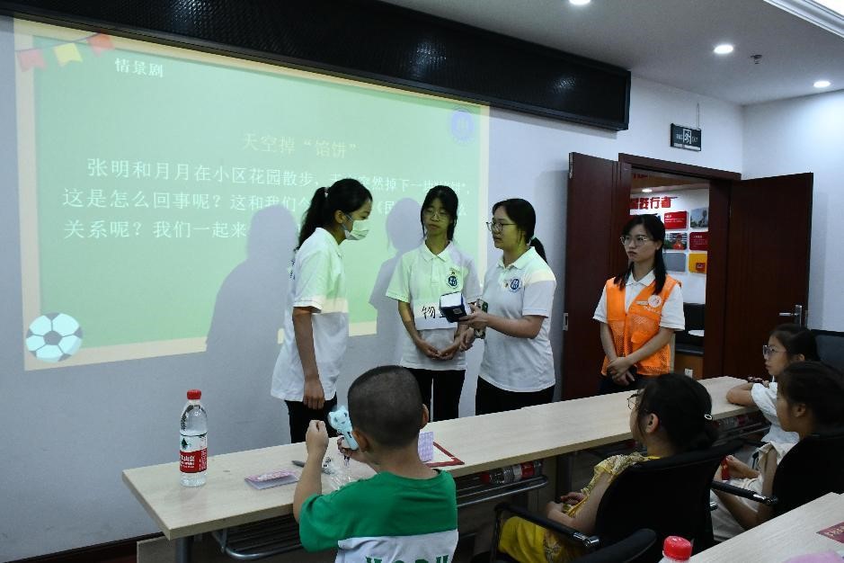 活动现场,大学生志愿者向社区妇女儿童分享《民法典》普法小视频,讲解我国公民在不同年龄段所享有的权利和义务。大学生自编自导自演的普法情景剧“天上掉馅饼”,生动形象地展示了《民法典》在社区高空抛物案件中的运用。表演结束后,小朋友们分享了自己的收获。