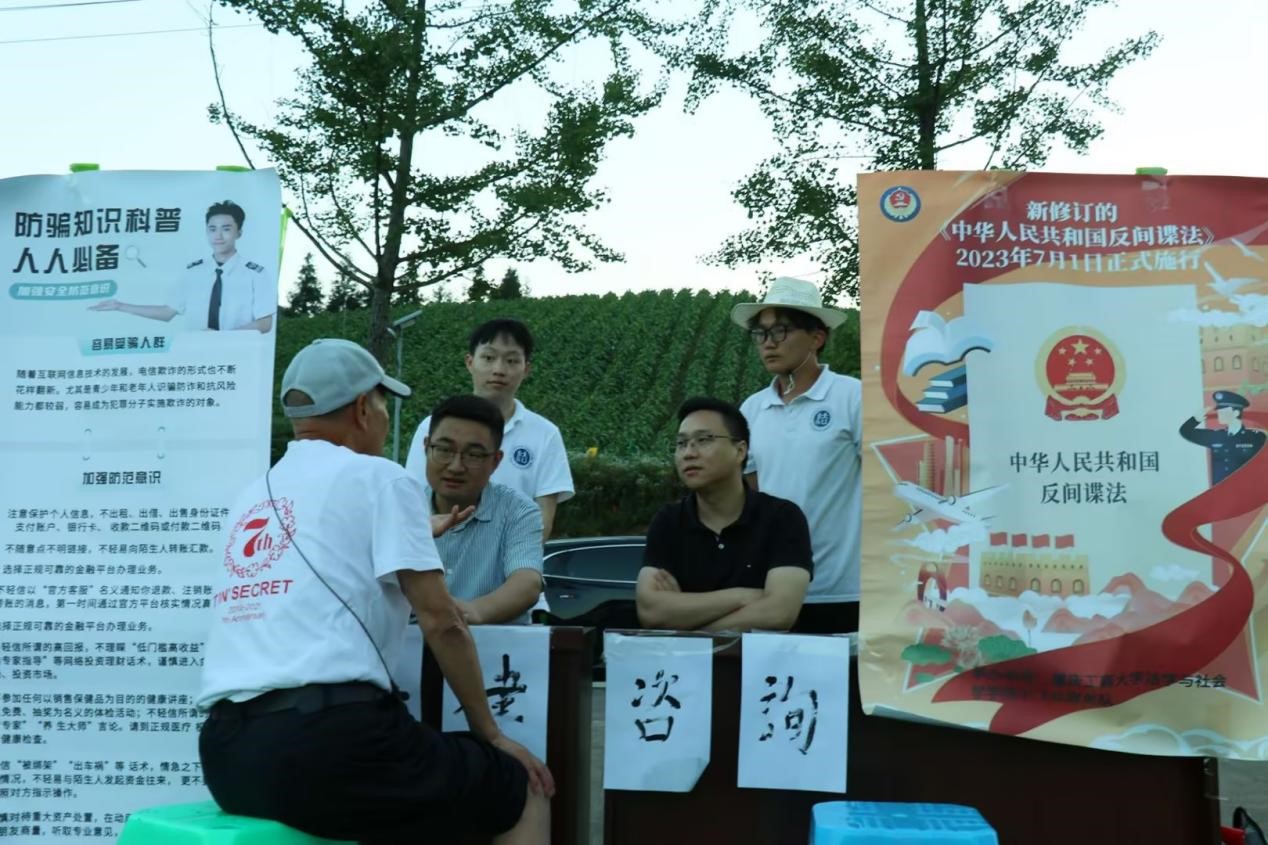 在太平乡政府工作人员的带领下,服务队一行还走访了太平坝乡司法所所长何家伟,了解当地反诈防骗宣传工作开展情况及典型案例。何家伟带领服务队师生在太平乡凤凰社区广场依托“百姓大舞台”开展防范诈骗普法宣讲和小品演出,并设立法律义务咨询点,由法学系主任公杰博士与向往博士为群众提供法律义务咨询。