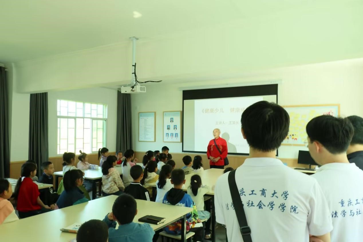 在太平乡青少年家庭教育互助会的指引下,服务队师生走进留守儿童暑期互助课堂,联合81岁的重庆十佳健康老人、重庆市十大公益人物、重庆弘道国学研究院党支部副书记、南岸名嘴“王笑长”(原名王文栋)为当地留守儿童开展了一场别开生面的党史教育与普法课堂。王爷爷为小朋友们带来长征路上的红色故事,带领小朋友们演唱中国少年先锋队队歌《我们是共产主义接班人》,团队成员傅罗杰为大家带来无产阶级革命家任弼时的故事,通过党史知识竞答将这堂党史课的氛围推向高潮。