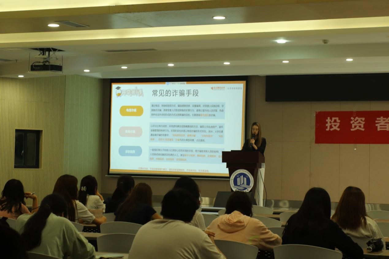 熊昵芹从大学生容易被诈骗的原因、常见的诈骗手段、提高反诈意识以防患于未然、学习金融知识以保护个人权益四个方面进行讲解。她先从社会闭塞效应、网络接触积极分子、求职心理急切、价值观念养成时期四个方面分析了大学生容易中招的原因,并列举出了常见的诈骗手段。其中高薪入职、暑假兼职、校园贷等诈骗手段成功利用大学生社会经验不足的弱点,导致大学生易受骗。同时,她针对先前所提及到的诈骗案例,总结提高反诈意识的方案。熊昵芹提示大家,中国投资者网站是中国证监会管理的公益网络服务平台,投资者可以通过阅览权威消息的发布、政策解读了解市场行情,也可以通过投资者联络专区与相关从业人员进行交流,投资者要学会正确运用中国投资者网站。