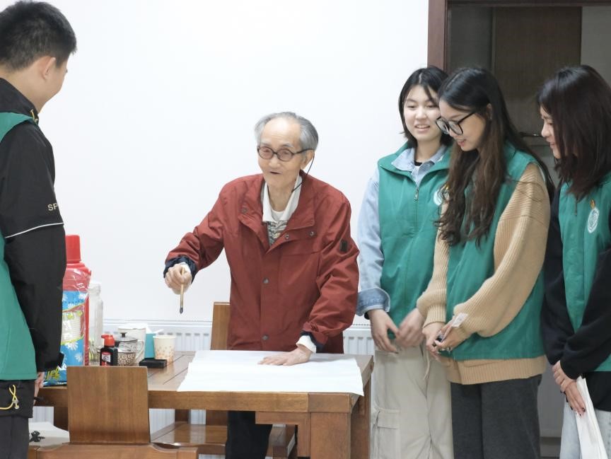 活动开始,志愿者们分成四个小组分别前往学校离退休教师季祖辉、刘兆生、熊贵泰和文光理家中拜访慰问,为离退休教师们送上米和油等生活用品。随后,志愿者们与离退休教师谈笑风生,追忆教书育人往事。此外,志愿者们还帮助退休教职工们打扫卫生。在季祖辉老师家中,季老师与志愿者们共同追忆当兵往事与教书历程;在熊贵泰老师的家中,熊老师与志愿者们共同进行书法创作,笔墨之下“好好学习,天天向上”的八个字体现了熊老师对学校青年学子的殷殷嘱托;在刘兆生老师家中,刘老师与志愿者们谈到学校发展近况;在文光里老师家中,文老师的儿子向志愿者们介绍学校的历史沿革;最后,文老师将三本亲笔著作送给了志愿者,表达他对志愿者们的殷切希望与浓浓情意。