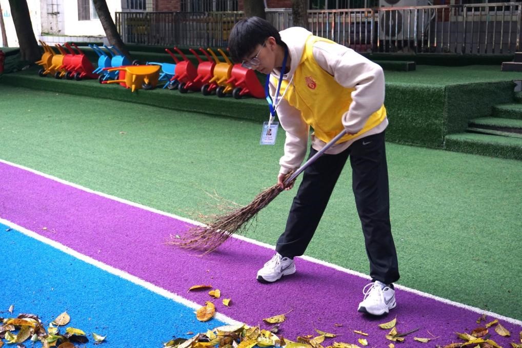 清晨,志愿者们走进乐一融合幼儿园,满怀热情认真打扫操场落叶、清洁走廊卫生,为孩子们营造了更加美好的成长环境。为锻炼孩子们的生活自主能力,志愿者耐心引领小朋友们晾晒衣服、袜子。随后,志愿者分成两个队伍,分别带领孩子们外出亲近大自然。一路上,带领小班的志愿者给孩子们科普交通安全知识,纠正不良的行为习惯,引导他们主动社交,认识新鲜事物;带领大班的志愿者与孩子们一起互动玩游戏,鼓励他们敞开心扉。孩子们纯真的笑容温暖着每一个志愿者,志愿者们也在潜移默化中治愈着他们。