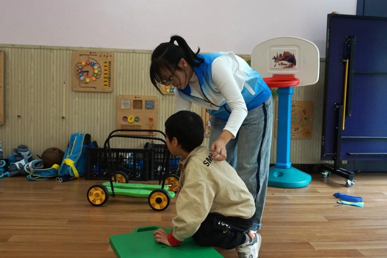 志愿者们在幼儿园老师的指导下,辅助陪伴小朋友们上课、观看动画片。同时,志愿者与小朋友们在室内娱乐室和室外沙滩开展了多样的娱乐活动。志愿者们通过推车、篮球以及搭建积木帮助小朋友们锻炼动手能力和思维能力。另一方面,志愿者通过沙滩和滑梯,积极与小朋友们互动,传递快乐情绪,引导他们改善社交障碍,提升社交能力。