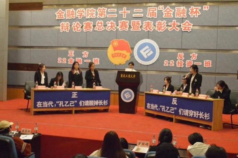 22级金融一班和22级投资一班辩论队围绕辩题“在当代,孔乙己们应该脱下长衫还是穿好长衫”展开激烈辩论。正反方准备充分,双方旁征博引、有来有往,全场气氛热烈。经过激烈角逐,22级投资一班夺得“金融杯”辩论赛冠军。