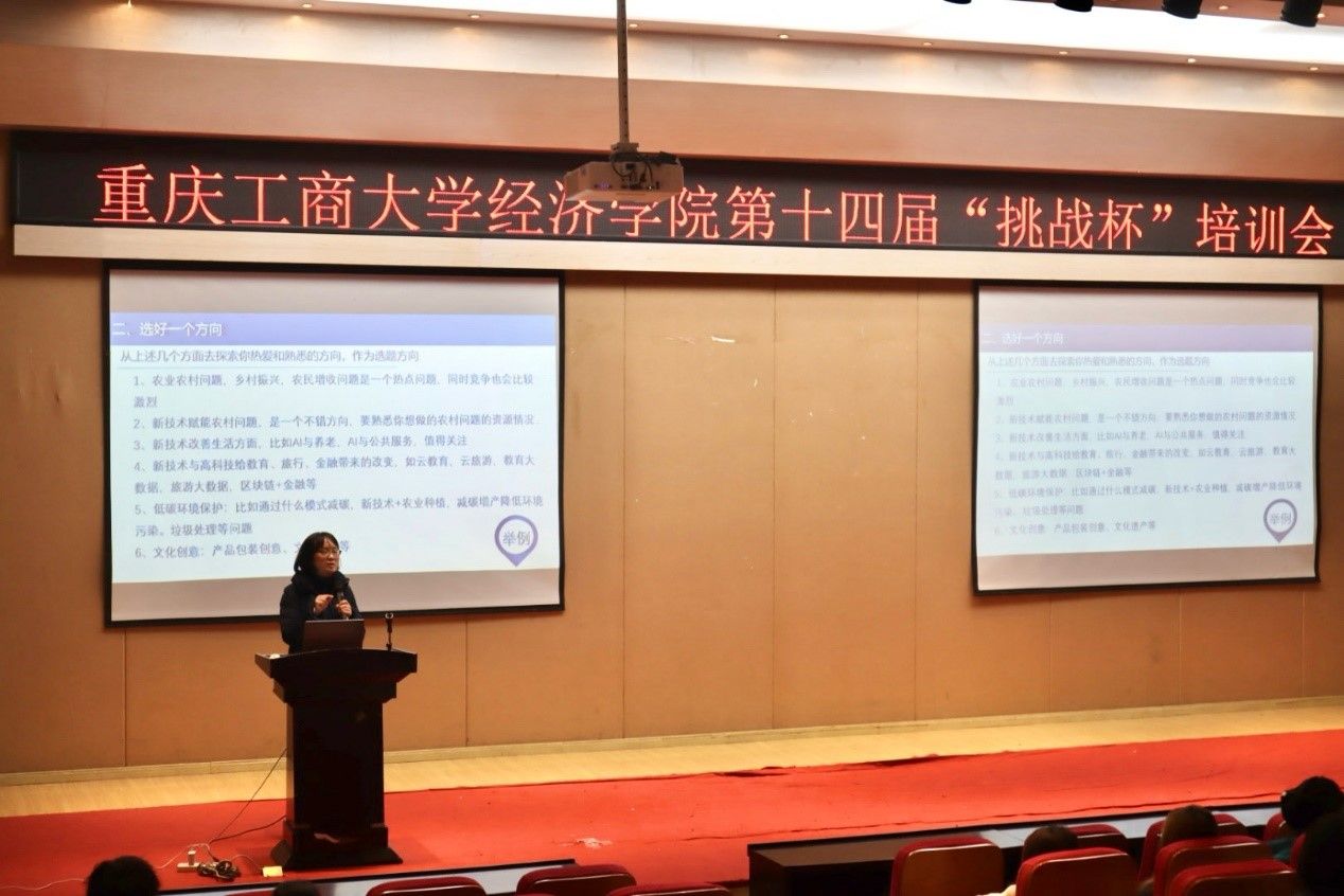 为加强经济学院学子对本届“挑战杯”竞赛内容与评分细则的理解,解答同学备赛问题,增强选手竞赛自信心,12月13日中午,经济学院分团委学生会在田家炳书院209举办第十四届“挑战杯”中国大学生创业计划竞赛经济学院院内选拔赛培训会。本次培训会面向我校全体经济学院学子。经济学院贸易经济系主任,第十八届“挑战杯”全国大学生课外学术科技作品竞赛重庆赛区特等奖队伍指导老师杨海丽教授作为嘉宾出席本次培训会。