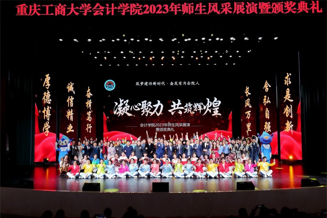 12月22日下午,会计学院在剧院隆重举行2023年师生风采展演暨颁奖典礼。本次活动以“筑梦建功新时代、奋发有为会院人”为主题,校党委书记曾维伦,党委常委、副校长李国军,党政办公室、学工部、教务处、校团委等部门负责人,会计学院全体师生、退休教师代表,学院合作企业天健会计师事务所重庆分所、大信会计师事务所重庆分所负责人等近千人参加了活动。