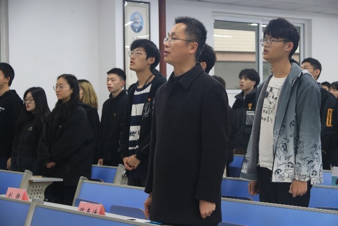 入团仪式在庄严的国歌声中拉开帷幕,全体预备团员同工作人员肃立,奏唱国歌。紧接着,工作人员宣布经学院团委批准加入共青团员69人名单,由老团员代表为新团员代表颁发其团员证,新团员代表李泽昊带领新团员进行宣誓。团员代表朱鹏举为新团员宣布团章中相关义务及权利条款。