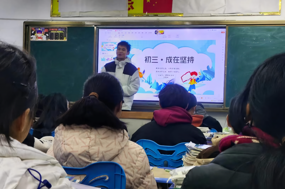 献深情于家乡,做青春的贡献。金融学院2022级金融科技实验班冷俊锐在寒假期间回到母校四川省绵阳市桑枣中学,在那里举办了一系列的专题讲座,与同学们分享他的学习经验和生活感悟,让他们感受到不同的思考视角和生活可能。他以自身中考经验为基础,开展“如何走向中考成功之路”主题讲座,同初三学子分享备考经验和考试技巧,鼓励他们勇敢地追逐梦想。同时,他也关注备考学子的心理健康,通过开展“挑战自我、积极应对”心理建设课、面对面交谈、匿名分享等方式帮助学子缓解压力、调整心态,得到了学校师生的高度赞扬。他表示这次回家的实践让他充分实现自我价值的同时感受到了帮助他人的快乐,他希望带动更多的青年学子参加“返家乡”社会实践,为家乡的建设添砖加瓦。