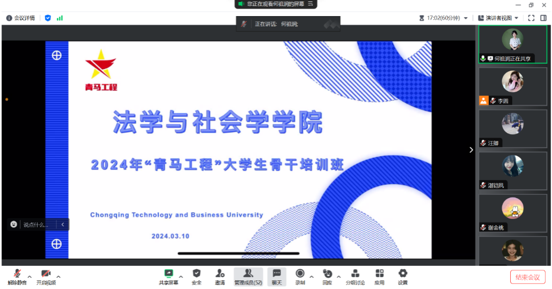 为进一步宣传党的二十大精神,学习贯彻习近平新时代中国特色社会主义思想,培养有理想、敢担当、能吃苦、肯奋斗的优秀青年,3月10日,法学与社会学学院在线上举办2024年“青马工程”大学生骨干培训班开班仪式暨第一课。第一课邀请到团重庆市委高校工作部干部梁辉担任主讲人,学院分团委书记何祖润以及50余名团学骨干参会。