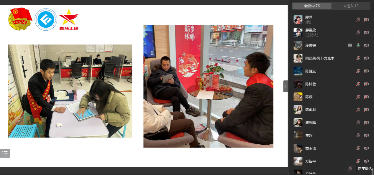 为展示金融学子2024年寒假社会实践风采,引导金融学子通过社会实践深入学习党的二十大精神,正确把握前进方向,3月13日,金融学院以“寒假实践显能耐,青春金融展风采”为主题的第五期青马工程培训在企业微信线上举行。本次培训邀请寒假社会实践优秀学子22级金融工程专业学生邱薇竹、22级金融学院专业学生冷俊锐进行实践经验分享,会议由22级金融学院专业学生廖嘉欣主持。