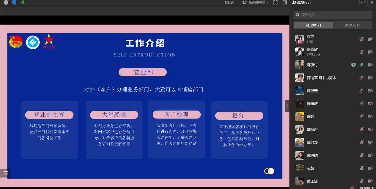 首先,邱薇竹同学进行寒假实习经验分享,她本次实习的地点是重庆银行两江分行。邱薇竹将本次分享分为了四个部分。她以工作介绍这一部分进行切入,向大家展示了她的工作环境和交通状况。紧接着她通过播放视频的方式着重为大家展示了她的工作内容,精美生动的视频让大家仿佛身处其中,提前感受到了工作的紧张和有趣。她分享到,在银行工作软实力有时候比硬实力更加重要,良好的工作环境、人际关系往往是做好工作的第一步,学会如何与人交往是进入社会的必修课。最后,她说到本次实习带给了她很多新的收获,她建议大家在时间充足、精力允许的条件下走出课堂参与社会实践,以此来探索和培养自己的能力。同时对于实习她建议大家要放平心态,不随波逐流,坚定自己的人生选择。