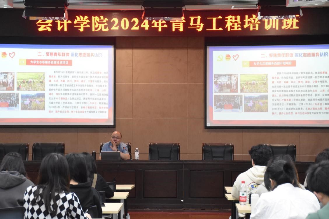 团市委青创中心副主任雷筱从“回顾发展历程,读懂志愿服务内涵”、“聚焦青年群体,深化志愿服务认识”、“练就过硬本领,扎实志愿服务品牌”、“加强思想引领、凝聚志愿服务力量”等四个方面开展培训。他通过回顾重庆青年志愿服务发展历程,更深入地读懂、领悟志愿服务的内涵,鼓励青年大学生聚焦青年群体,深化志愿服务认识。中国科学院重庆绿色智能技术研究院刘志龙作题为“培养堪当大任的新时代‘青马人’—如何做好学生干部”主题讲座。他从学生干部分类、学生干部贡献、担任学生干部利弊、学生干部的角色定位、学生干部基本要求、学生干部作用、学生干部不足、学生干部自律公约等多个方面对如何做好学生干部进行详细全面地讲解。面对当下复杂的国际形势,他提醒学生干部要时刻保持警惕,明确方向,顾全大局,公平公正,乐于奉献,勇担时代使命。最后,他鼓励会计学院广大学生干部们努力成为胸怀大我、锤炼自我、拼搏忘我、建功有我的新时代青年。
