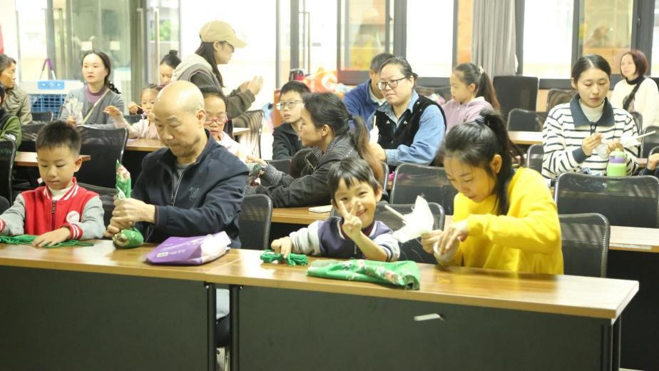 活动准备期间,志愿者们在桌面上布置艾草、布条等制作艾草锤所需材料,主持人在台上检查演示PPT,众人团结协作、认真负责筹备活动。情满彩云湖,敬老行动传佳话。活动伊始,主持人耐心地向老人和小朋友们讲解艾草锤制作方法与文化意义,志愿者们在台下提供帮助,引导他们制作艾草锤。小朋友跟着老人们学习如何折叠布条、如何固定艾草、如何调整艾草的位置……每一个步骤都充满耐心和细致,现场笑声盈盈,温暖人心。