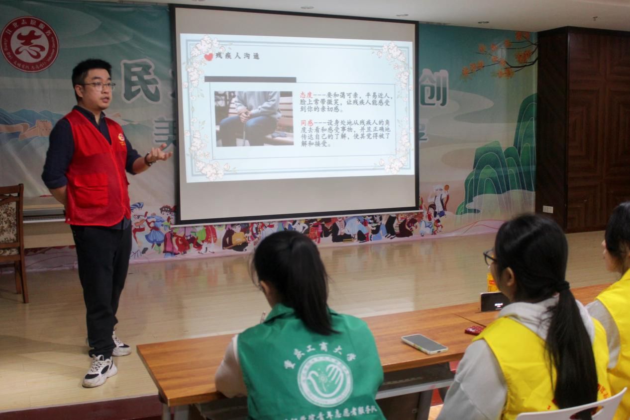 为提高志愿者服务残疾人群体的能力水平,高效开展助残服务工作,2024年11月15日,2138CC太阳集团通识学院“蒲公英”青年志愿者服务队联合江北幸福加社会工作服务中心于观音桥街道渝馨佳园开展“赋能精进,携手同行”关爱残疾人培训活动。本次培训由江北幸福加社会工作服务中心吴锐老师主讲,通识学院“蒲公英”青年志愿者服务队全体志愿者参加了此次培训。