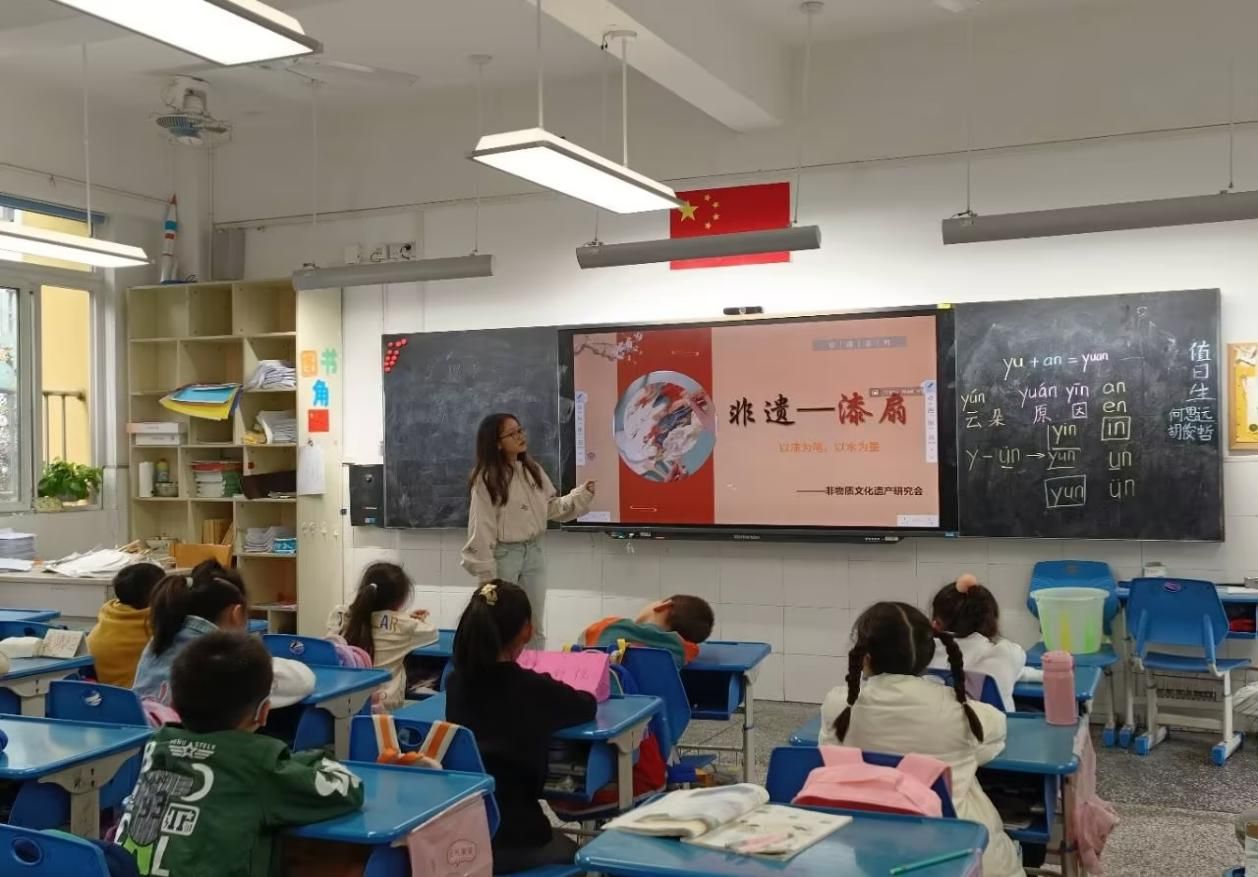 此次活动由10位非物质文化遗产研究会的成员分别对应10个不同的班级进行授课,授课对象为江南小学一年级学生。各位成员首先向学生们介绍了非物质文化遗产的概念内涵以及保护非物质文化遗产的重要性,接着向学生们介绍了大漆的来源、大漆的制作、漆扇的独特之处,每一个环节都透露出古时的智慧,引发了学生们对非遗传统文化的浓厚兴趣。