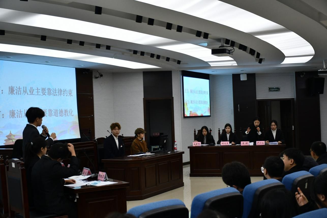12月6日,由重庆廉政与审计治理研究中心、法学与社会学学院主办,大学生廉洁文化研究会、法学与社会学学院辩论队联合承办的“12 •9”全国大学生廉洁教育月之“法律重锤与道德春风”辩论赛在南岸校区慧智楼模拟法庭举行,此次辩论赛以“廉洁从业主要依靠的是法律还是道德制约”为题,邀请到法学系主任公杰,知识产权系主任焦海洋,法学类专任教师向往、卢博、许偲炜以及校辩论队4名骨干辩手担任评委,旨在通过思想的交锋与碰撞,深入探讨廉洁文化的内涵与价值,进一步增强全校学生的廉洁意识,推动清廉学校、清廉学院建设向纵深发展。