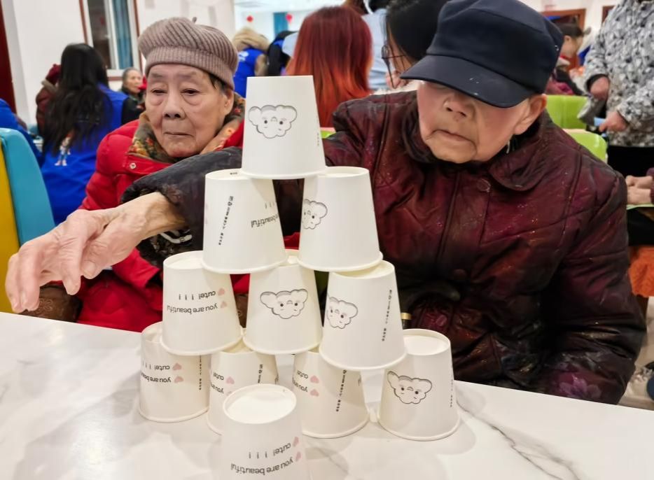 图 纸杯叠罗汉,老人与志愿者共赴趣味时光