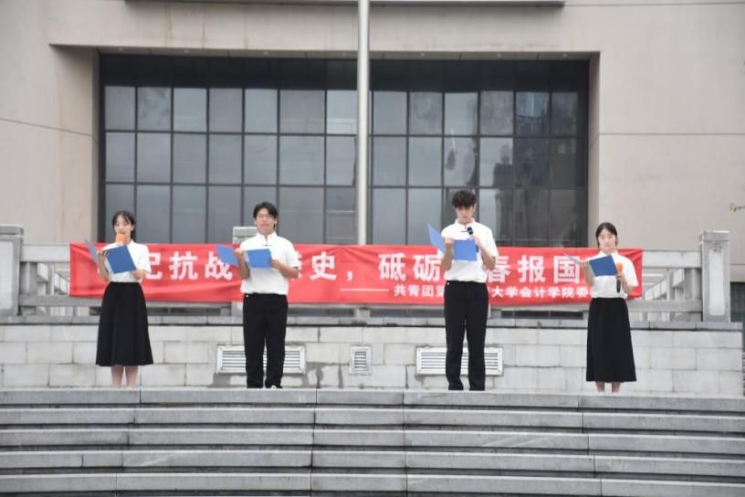随后,张馨月、罗宇翔、秦梓茜、易文培四位同学带来诗朗诵《以青春之我,筑强国之梦》。现场气氛庄重热烈,会计学院学子在活动中进一步加深对历史的认识,增强了传承精神、担当使命的责任感。