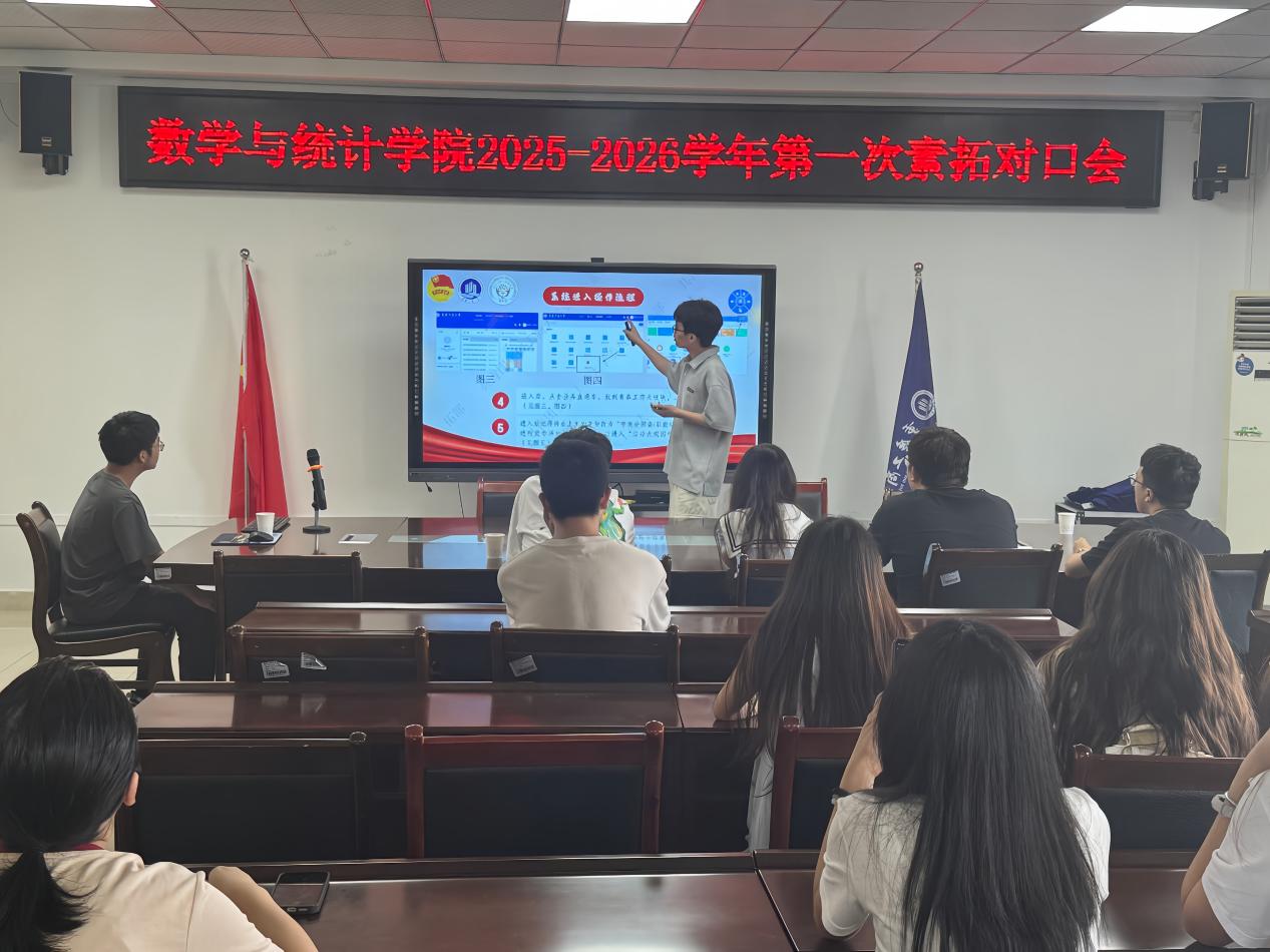 为进一步提升数学与统计学院素质拓展活动的效率性与规范性,9月28日,数学与统计学院分团委学生会在启智楼8602会议室开展2025-2026学年第一次素拓对口会。本次会议聚焦第二课堂活动的申报和发布流程,讲解其在企业微信平台上处理活动事项的操作规范。
