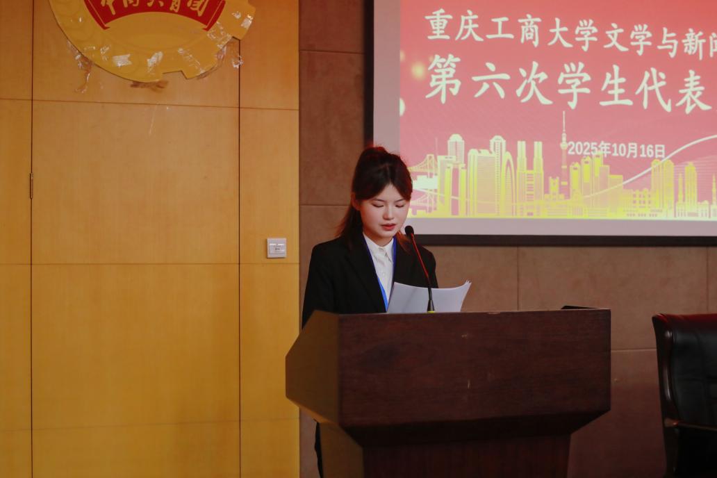 随后,主席团候选人吴小语代表文学与新闻学院第六届学生委员会作工作报告。她表示,回顾过去一年,在党委的坚强领导与团委的悉心指导下,学生会聚焦思想引领、成长服务、权益维护、组织建设四大核心,通过20余场理论学习、专题研讨、思政宣传筑牢了广大学子的信仰根基。她指出,学生会依托学生发展中心全面推进学风建设,组织并开展了2025年暑期“三下乡”社会实践活动,在服务乡村振兴的基层实践中彰显了“文新学子”的青年担当。同时,学生会参与了多项志愿服务活动,积极引导学生在志愿实践中受教育、长才干、筑贡献。她强调,新征程呼唤新担当、新使命激励新作为,各位代表、同学要高举习近平新时代中国特色社会主义伟大旗帜,练就过硬本领、勇担时代重任,让青春在奋斗中绽放绚丽光彩。