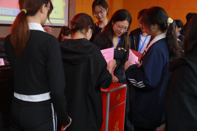 接下来,主席团候选人洪川露依次宣读各候选人的简历。四名候选人来自新闻学、广告学专业,他们学业成绩优良、综合素质突出,手握诸多奖项、荣誉并具有丰富的实践经验。全体代表在总监票员刘甜甜的主持下,经过公开、公平、公正的匿名投票,选举产生了刘钰婷、吴小语、洪川露三位同学作为文学与新闻学院学生会新一届主席团成员。